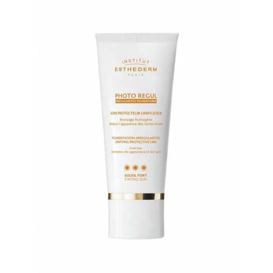 Esthederm Photo Regul Soin Protecteur Unificateur Soleil Fort 50 ml est un soin sous forme de crème qui permet d’atténuer les taches pigmentaires en réduisant le contraste entre les zones hyper-pigmentées et la peau bronzée, et garantit ainsi un bronzage uniforme et harmonieux.