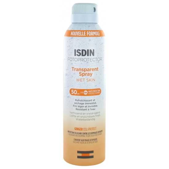 Isdin Fotoprotector Transparent Spray Wet Skin SPF50 250 ml est un spray transparent photoprotecteur à haute protection anti-UVA/UVB, résistant à l’eau.